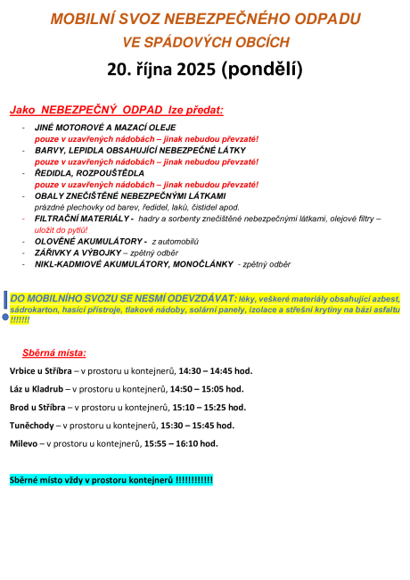 V sobotu 18. října a v pondělí 20. října proběhne ve spádových obcích svoz komunálního a objemného odpadu. Podrobnější informace najdete zde.
